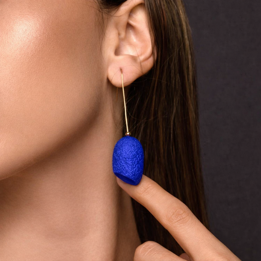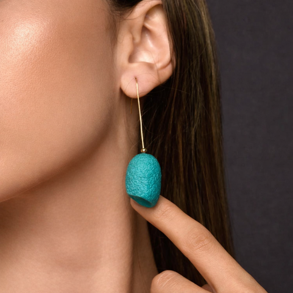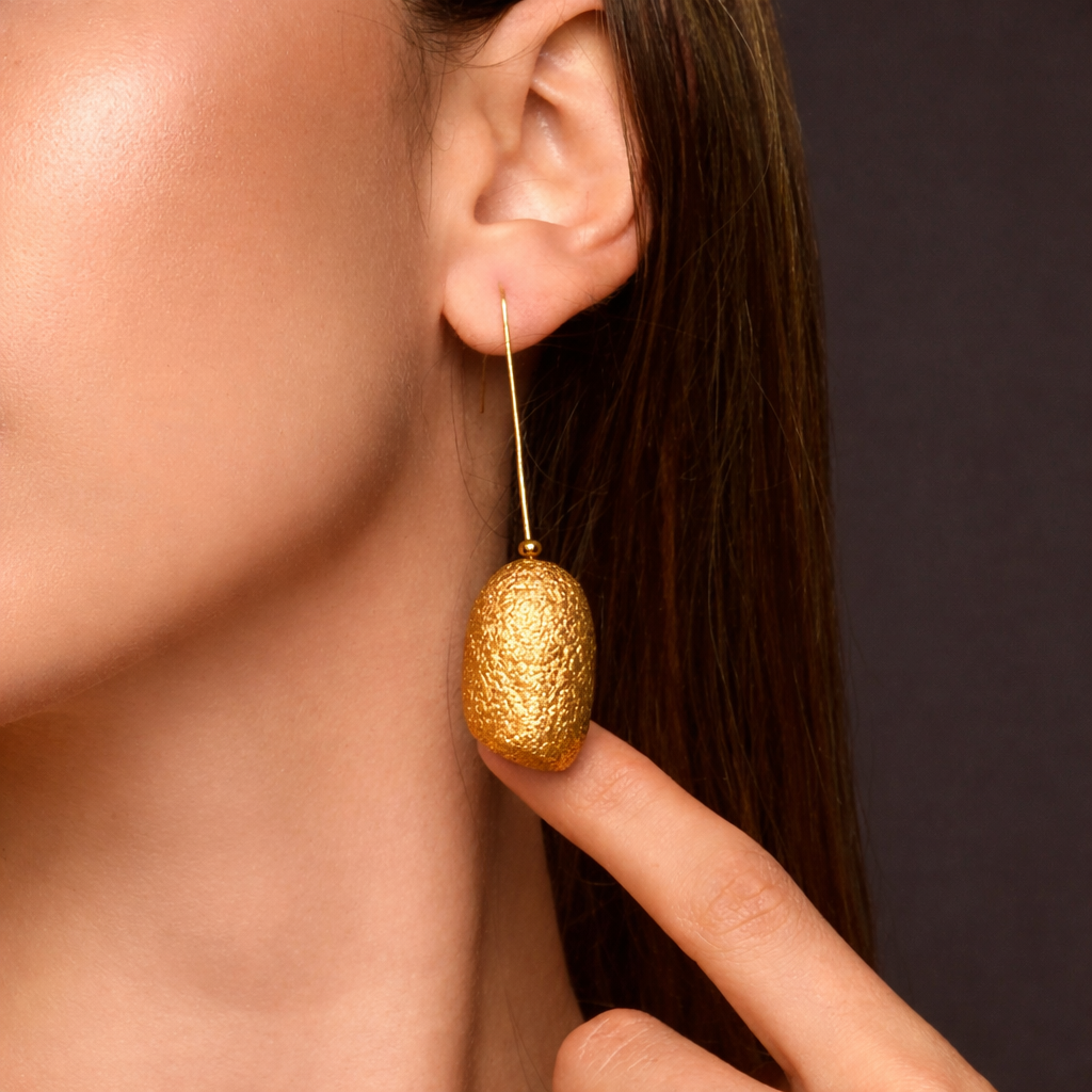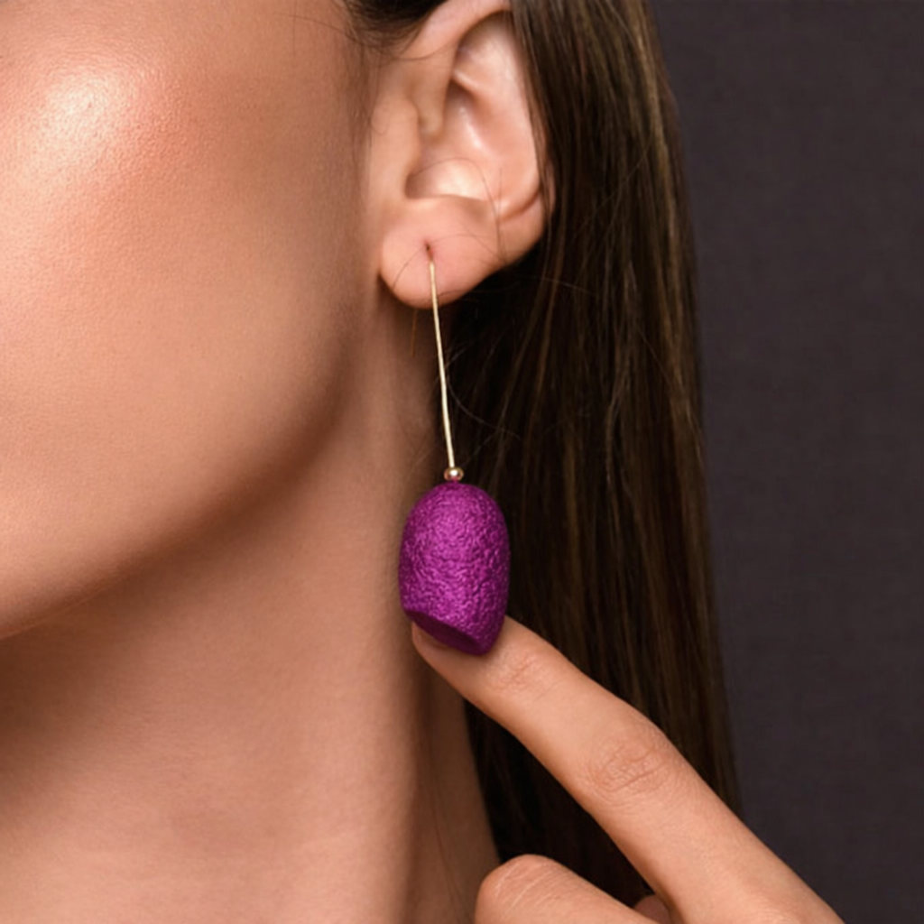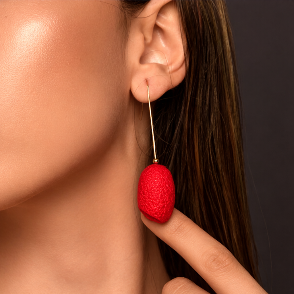 Lightweight and luminous, these earrings feature a single hand-dyed silk cocoon suspended from a fine gold-plated wire, allowing the natural beauty of the cocoon to take centre stage. Their elongated silhouette creates an elegant line, while the vibrant silk surface catches the light with subtle texture and depth.