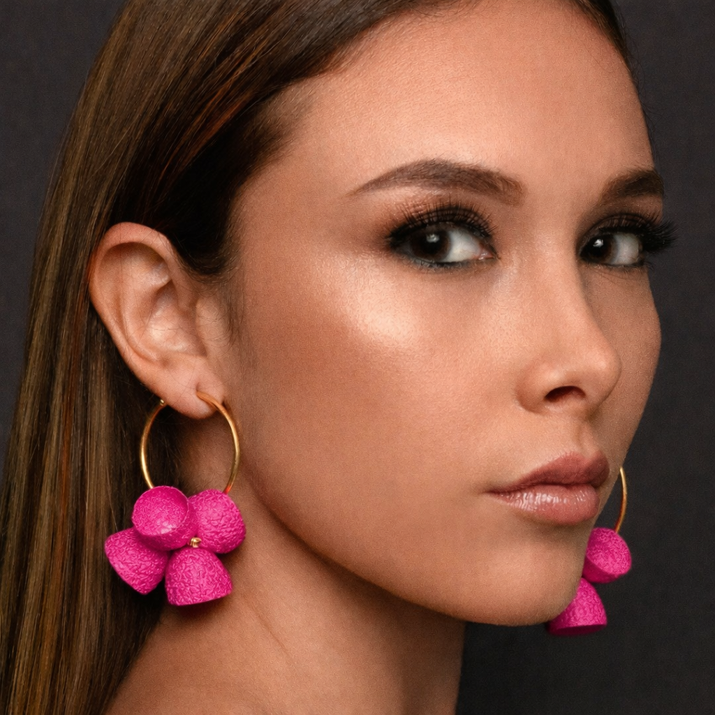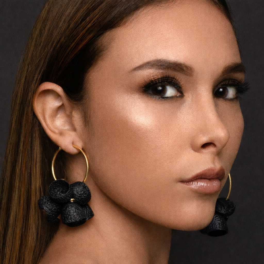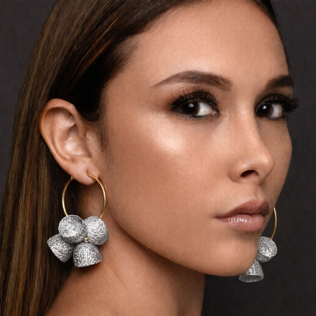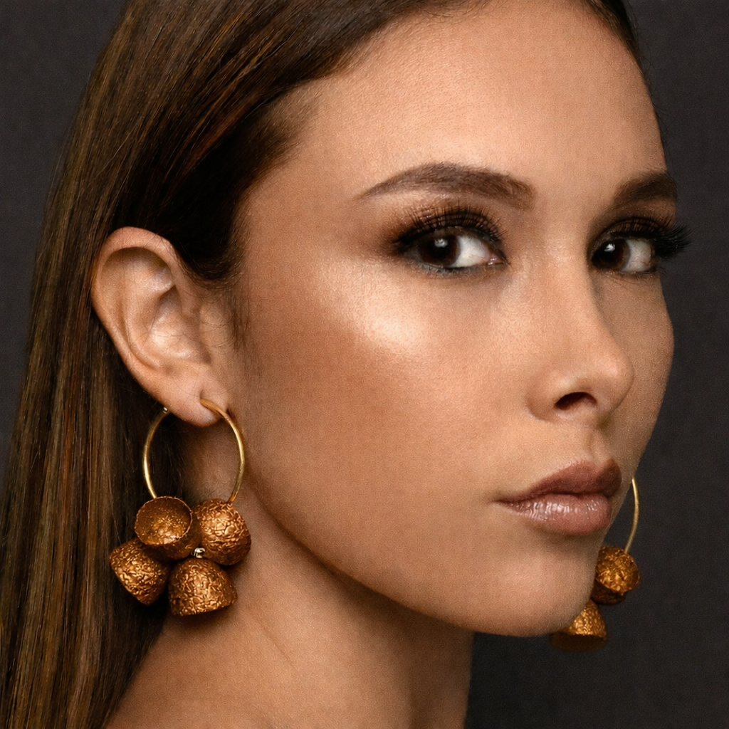 These earrings feature a cluster of hand-dyed silk cocoons suspended from a gold-plated hoop. The grouping highlights the organic shape and natural texture of the cocoons while creating a bold, sculptural form. Available on 4 cm and 6 cm hoops.